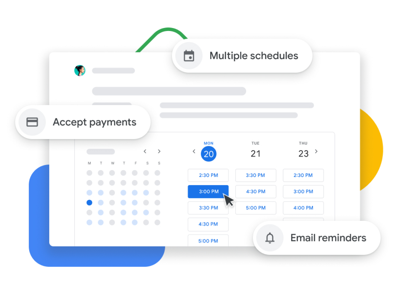 Obtén tus propias páginas de reservas profesionales y elige la disponibilidad que prefieras para que cualquier persona que tenga una dirección de correo electrónico pueda reservar una cita contigo. Configura las citas para incluir un paso de verificación, enviar recordatorios por correo electrónico, recibir pagos con Stripe y mucho más.