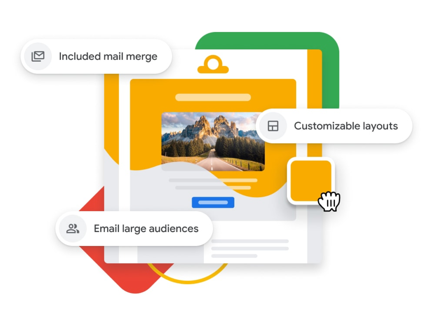 Promociona tu empresa con herramientas integradas de marketing por correo electrónico, incluidos diseños profesionales con tu marca. Usa la combinación de correo electrónico y personaliza mensajes para públicos más grandes, a la vez que administras tus contactos en Hojas de cálculo de Google.