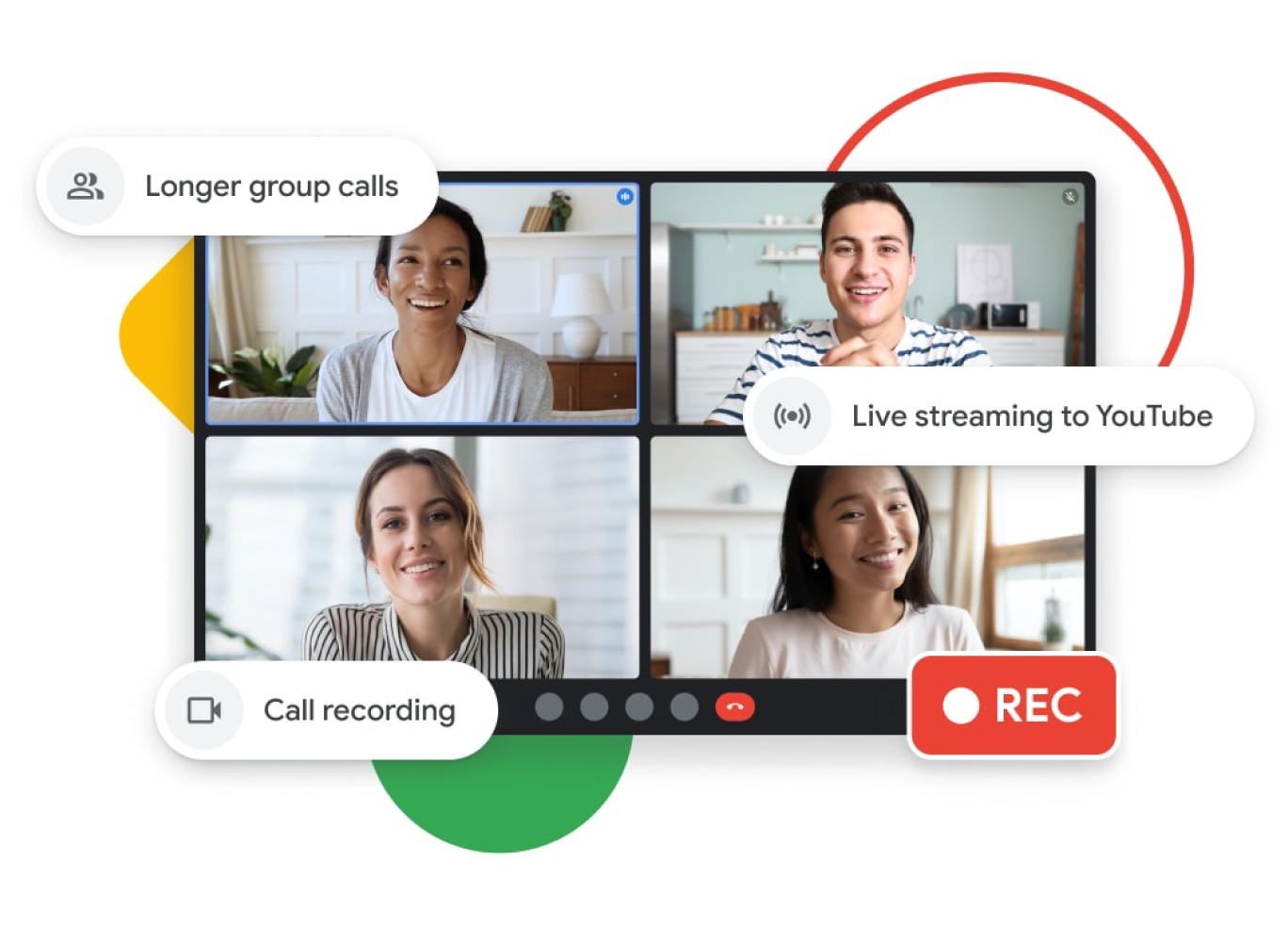 Invierte en tus comunicaciones empresariales con llamadas de grupo más largas, transmisión en vivo a YouTube, grabación de llamadas, cancelación de ruido y la posibilidad de unirte por teléfono. También disfrutarás de otras funciones para reuniones, como sesiones separadas y encuestas.